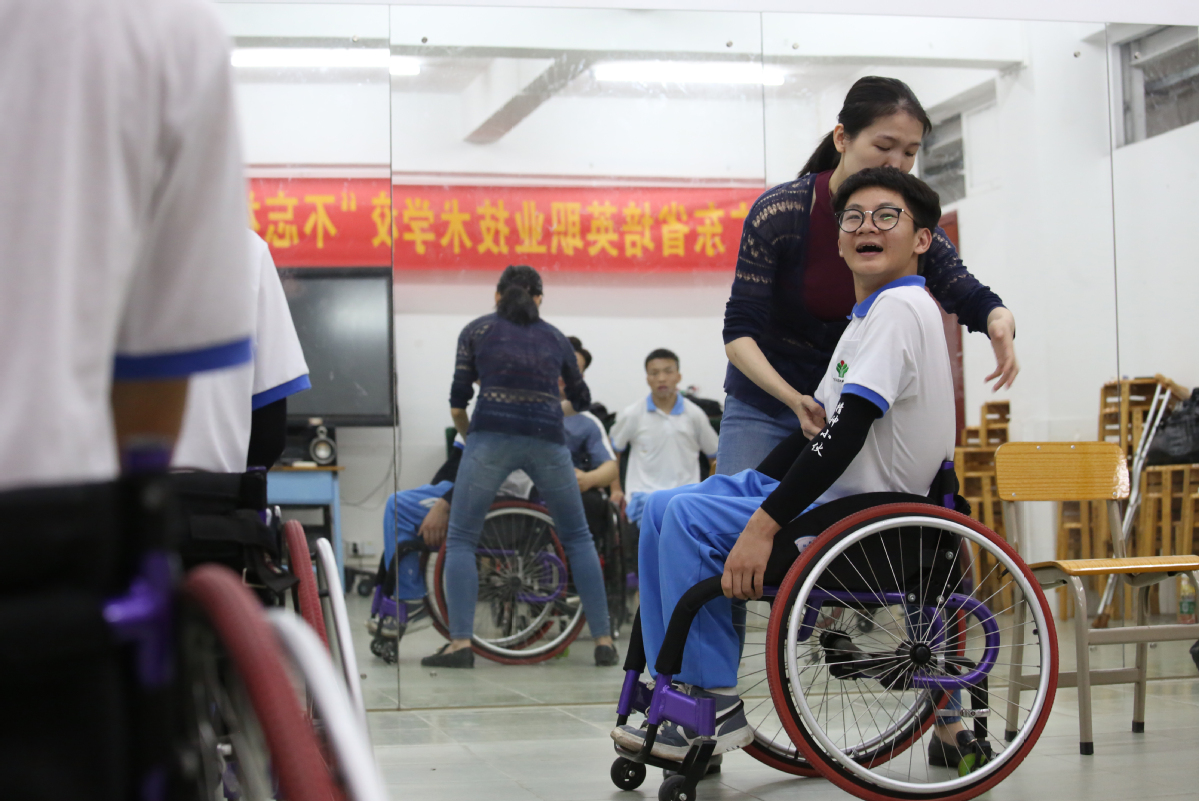 The student wheelchair dancers of Guangdong Peiying Vocational Technical School practice often. [Zheng Erqi/chinadaily.com.cn]