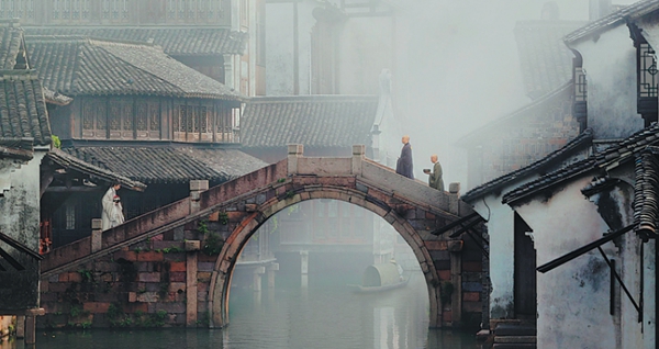 Two beautiful women in white and green dresses walk across an arched stone bridge over a pond, where colorful carp swim under lotus leaves. The scene, which looks like a Chinese ink painting, opens White Snake, the mainland's first Cantonese Opera film shot with the techniques of 4K, surround sound and high definition.