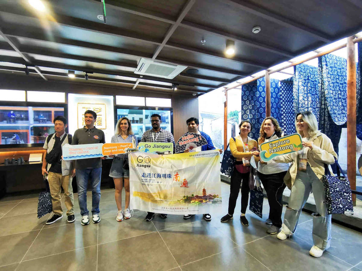 Following their arrival in Qidong, a county-level city of Nantong, the foreigners were treated to local musical and tea art performances, experienced the local art technique of Qidong printmaking, and were presented with a blue calico scarf as a souvenir.