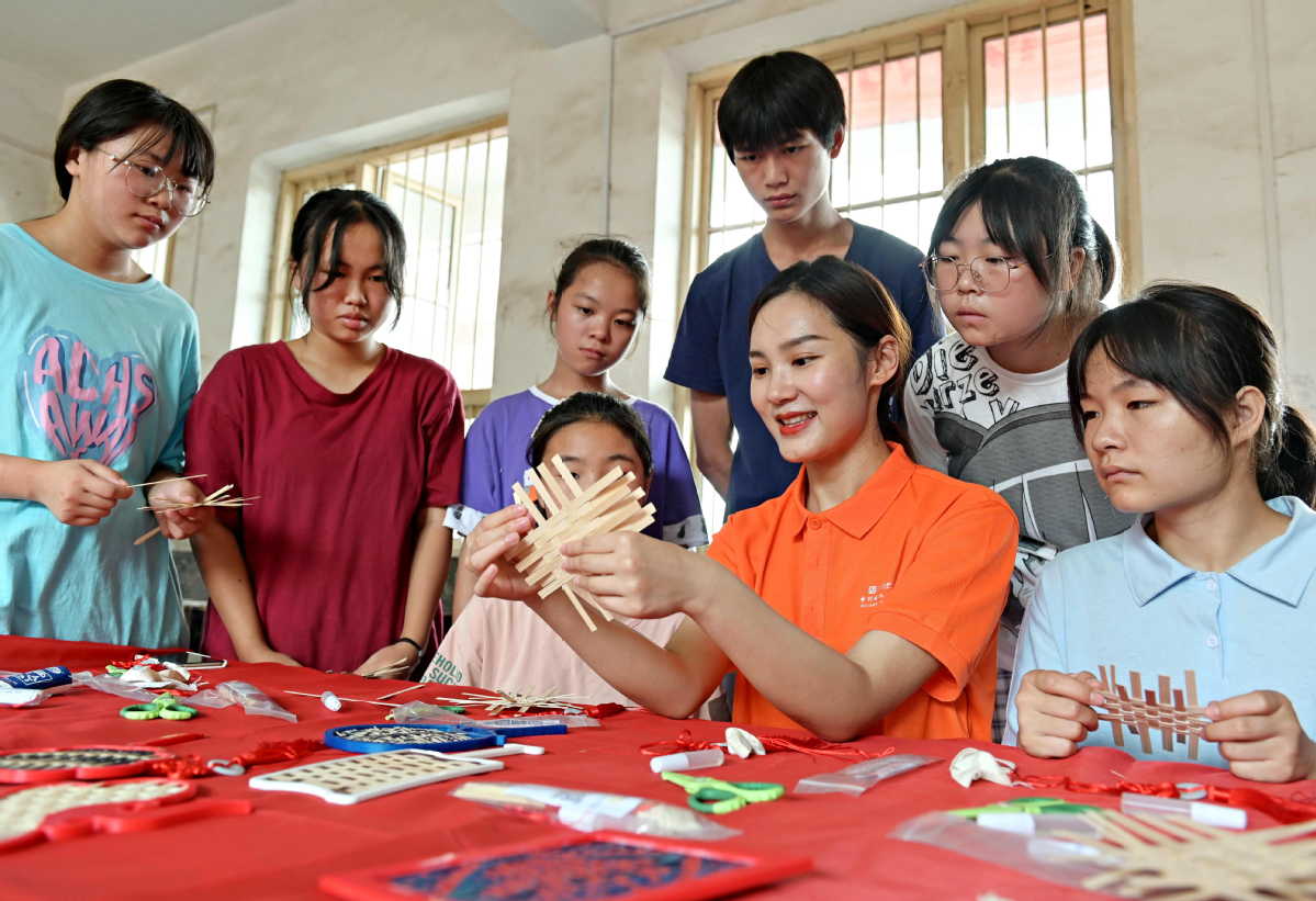 A university volunteer teacher instructs children in a rural school in Shaoyang, Hunan province, in bamboo weaving skills on July 23, 2021. [Photo/IC]