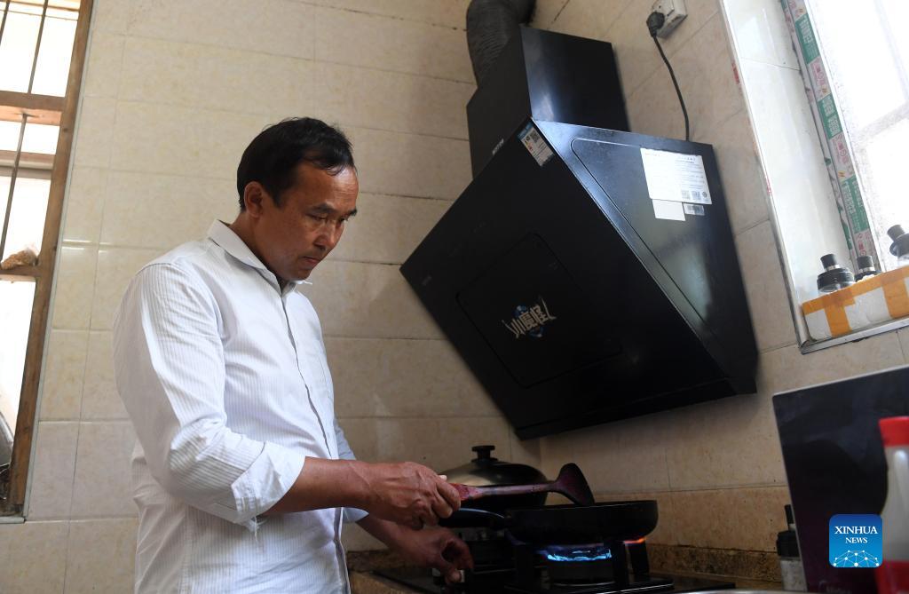 Ban Tongmao cooks at his home in Baini Village of Leye County, south China's Guangxi Zhuang Autonomous Region, Oct. 1, 2021. (Xinhua/Lu Boan)