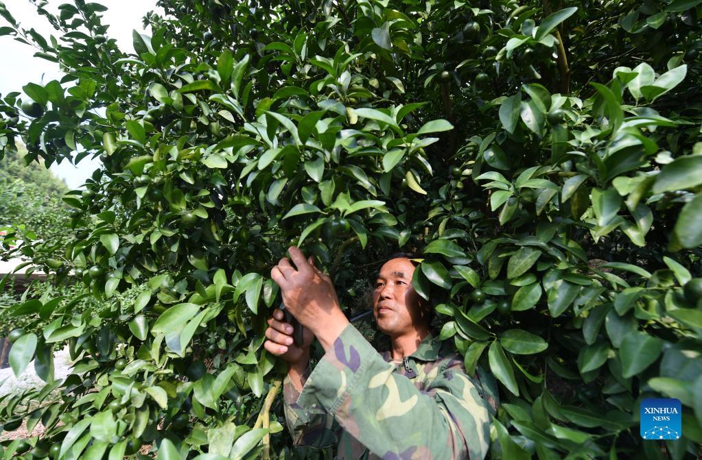 Ban Tongmao works at the sugar orange orchard in Baini Village of Leye County, south China's Guangxi Zhuang Autonomous Region, Oct. 1, 2021. (Xinhua/Lu Boan)