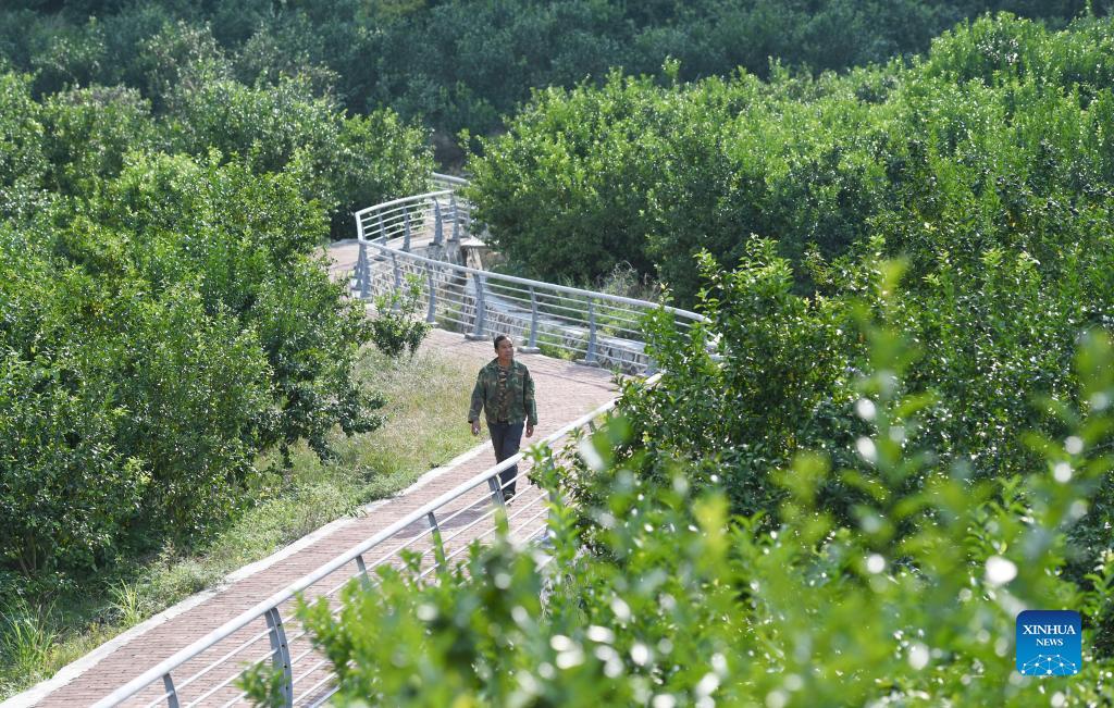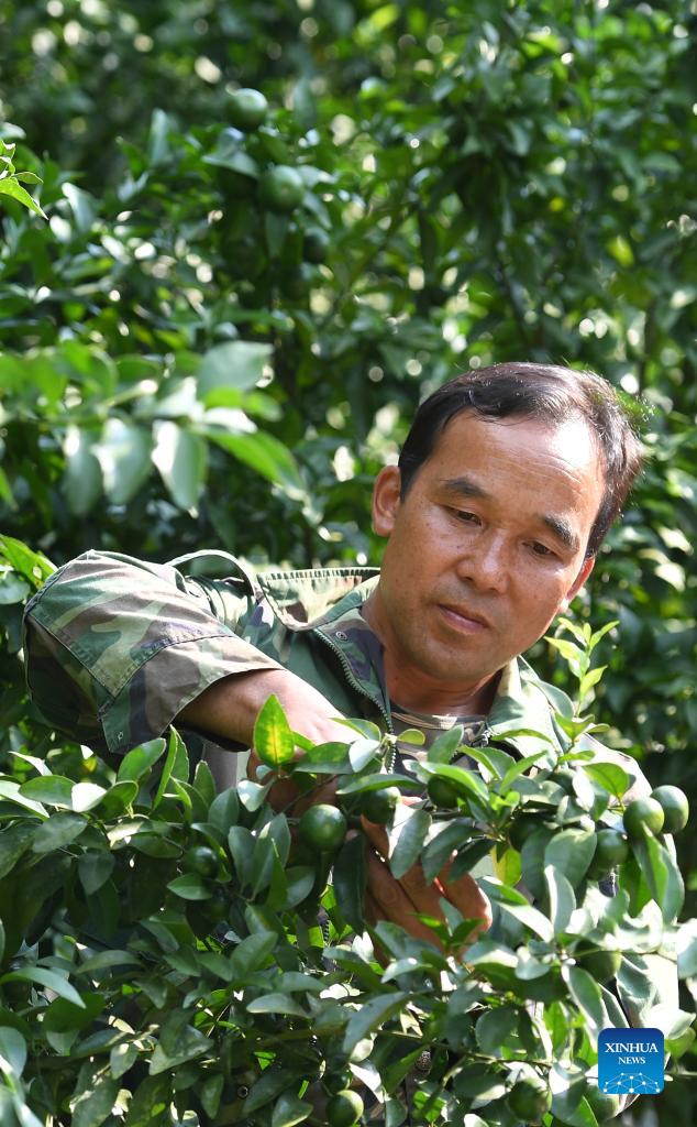 Ban Tongmao walks at the sugar orange orchard in Baini Village of Leye County, south China's Guangxi Zhuang Autonomous Region, Oct. 1, 2021. (Xinhua/Lu Boan)