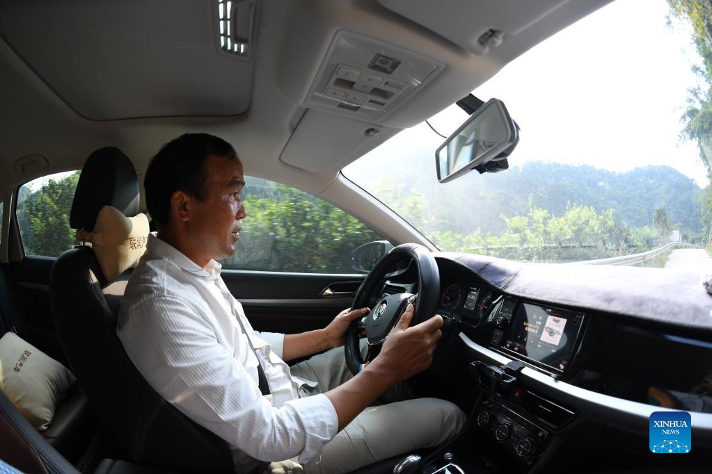 Ban Tongmao drives his car along a road in Baini Village of Leye County, south China's Guangxi Zhuang Autonomous Region, Oct. 1, 2021. (Xinhua/Lu Boan)