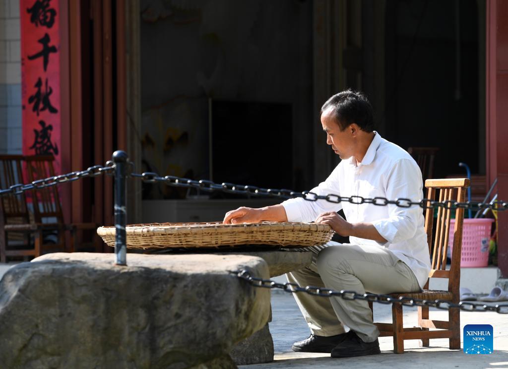 Ban Tongmao dries lemon slices in Baini Village of Leye County, south China's Guangxi Zhuang Autonomous Region, Oct. 1, 2021. (Xinhua/Lu Boan)