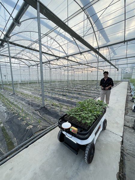 A technical worker pilots an unmanned vehicle for vegetable transportation at a fruit and vegetable plantation in the Pinghu agriculture economic development zone.[Photo provided to China Daily]