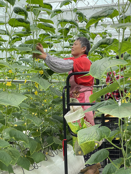 A farmer works on gherkins at the Xiangjiadang digitalization plant.[Photo by Yang Feiyue/China Daily]
