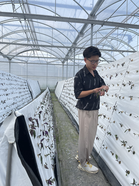 Zeshan Aslam from Pakistan works on plant-seedling technology and detoxification at an ecological garden in Jiaxing.[Photo by Yang Feiyue/China Daily]