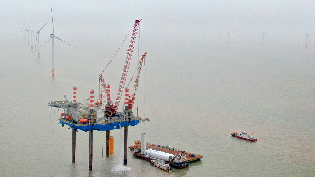 Rudong Offshore Wind Farm is under construction in Rudong County, Nantong City, Jiangsu Province, May 24, 2021. /CFP