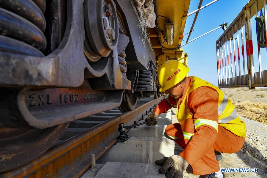 A worker lays railway tracks at the construction site of Hotan-Ruoqiang railway in Northwest China's Xinjiang Uygur autonomous region, Sept 25, 2020. [Photo/Xinhua]
