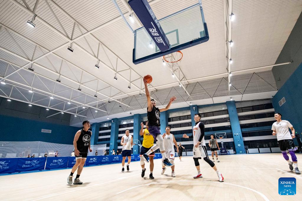 People play basketball at the Urumqi Olympic Sports Center in Urumqi, capital of northwest China's Xinjiang Uygur Autonomous Region, at 10: 24 p.m. Dec. 21, 2021.(Xinhua/Ma Kai)