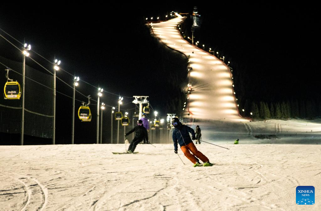 People ski at a resort in Urumqi, capital of northwest China's Xinjiang Uygur Autonomous Region, at 10: 14 p.m. Dec. 21, 2021. (Photo by Liu Xiaohang/Xinhua)