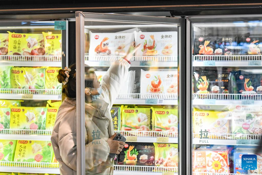 A resident buys dumplings at a supermarket in Urumqi, capital of northwest China's Xinjiang Uygur Autonomous Region, at 7:52 p.m. Dec. 21, 2021.(Xinhua/Ma Kai)