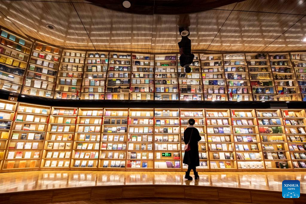 A citizen looks at books at a book store in Urumqi, capital of northwest China's Xinjiang Uygur Autonomous Region, at 7:31 p.m. Dec. 21, 2021.(Xinhua/Ma Kai)