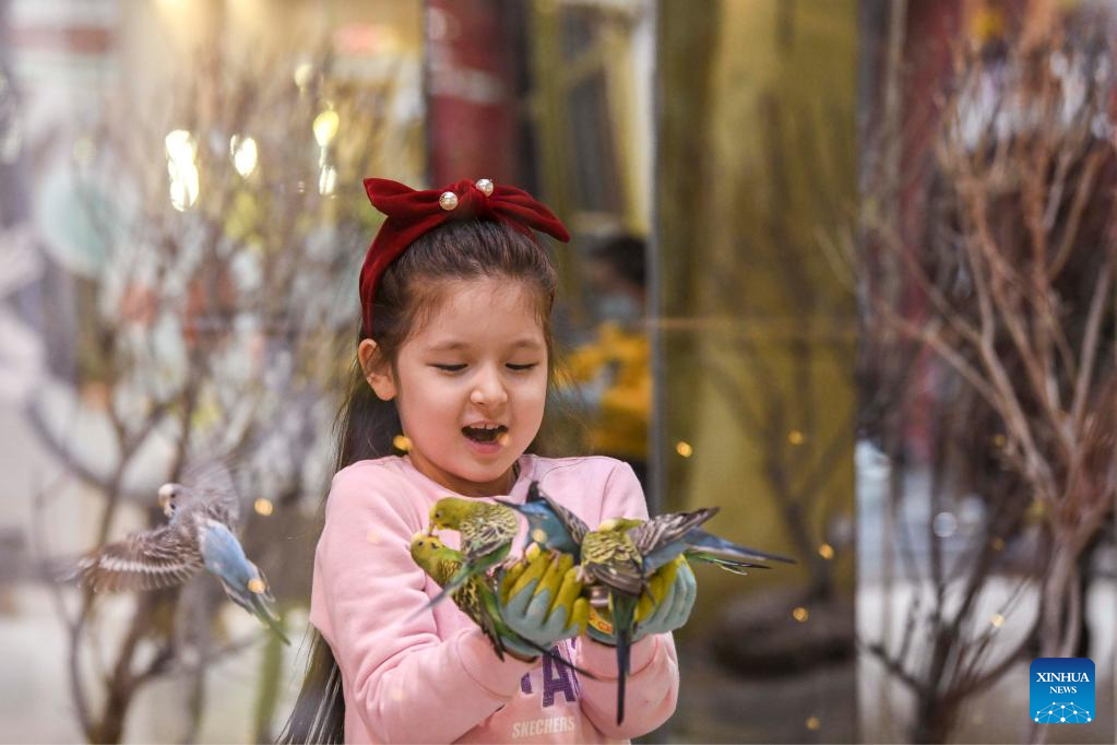 A girl has fun with birds at an amusement park in Urumqi, capital of northwest China's Xinjiang Uygur Autonomous Region, at 7:20 p.m. Dec. 21, 2021. (Xinhua/Ma Kai)