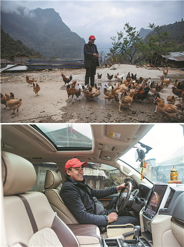 On Nov 25, 2021 Lhapa Tagye feeds chickens at his chicken farm (top) and sits in his car in Zhentang Town of Xigaze, Southwest China's Tibet Autonomous Region. [Photo/Xinhua]