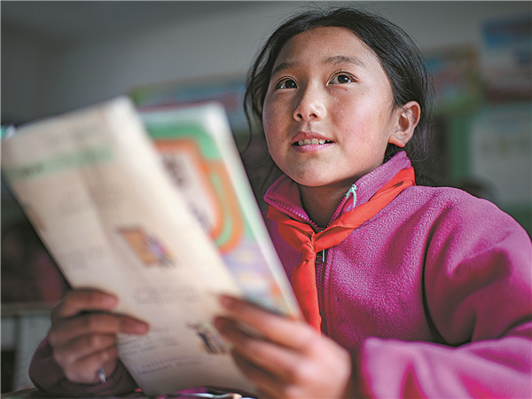 Third-year primary school student Wang Mo reads a textbook in class in Zhentang Town of Xigaze, Southwest China's Tibet Autonomous Region on Nov 24, 2021. [Photo/Xinhua]