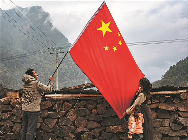 Nyima (R), a Sherpa villager in Zhentang of Xigaze, and his family hold a Chinese national flag in front of their house on Nov 25, 2021. [Photo/Xinhua]