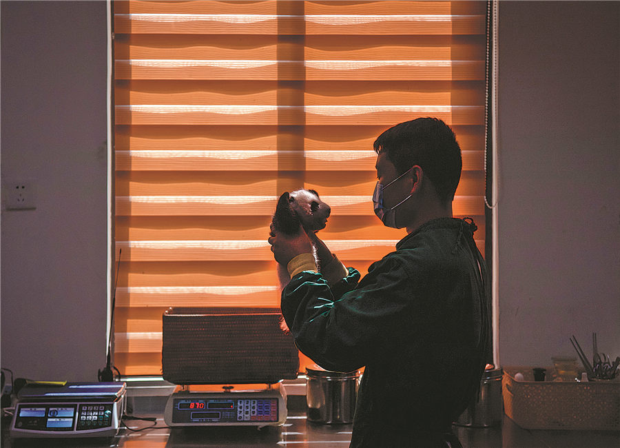 A nurse helps a panda cub defecate. HE HAIYANG/FOR CHINA DAILY