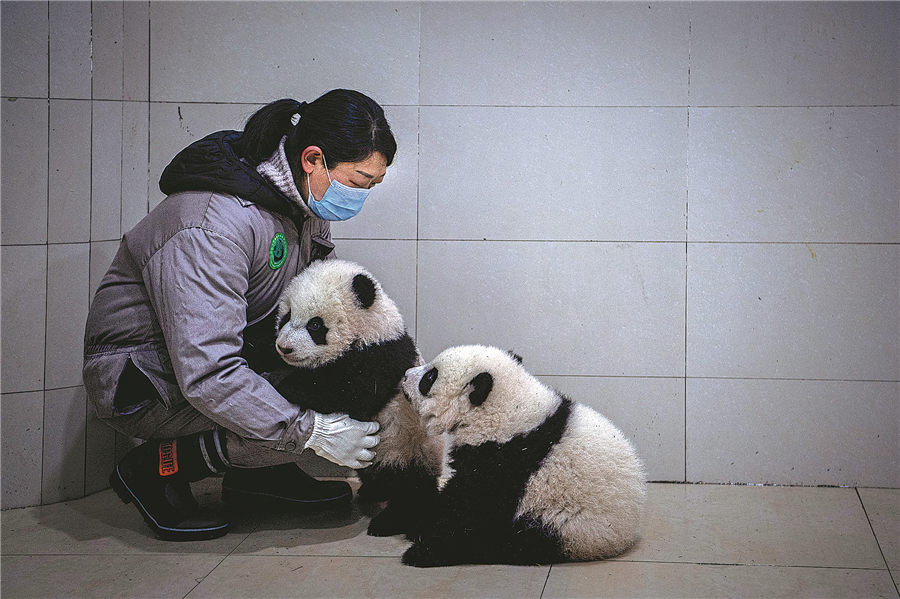 A staff member at the Shenshuping base takes care of a pair of giant panda twins born in 2020. HE HAIYANG/FOR CHINA DAILY