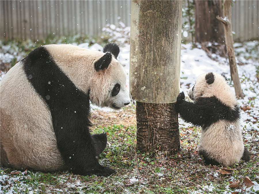 The giant panda Pingping and its cub play in the snow. HE HAIYANG/FOR CHINA DAILY