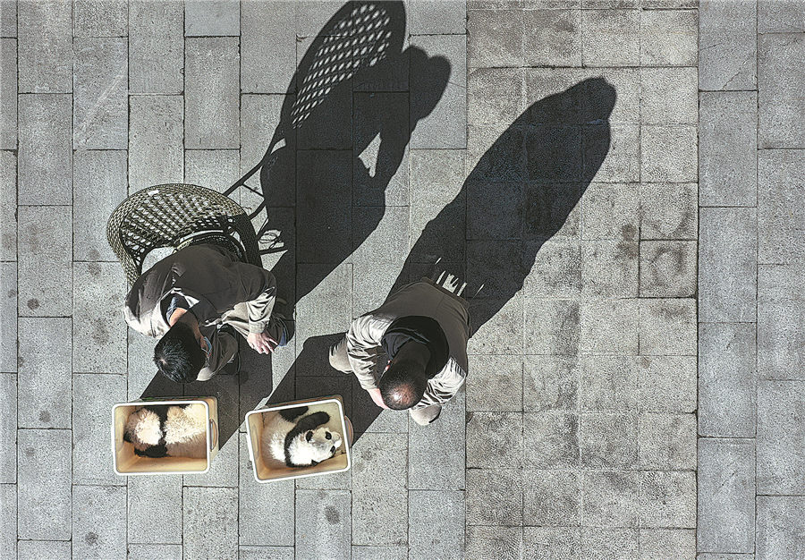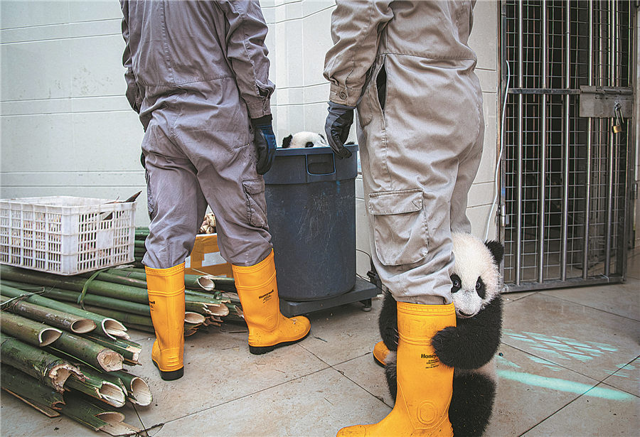 In the open space of the breeding ground, nurses take a few cubs out of the pen to enjoy the sunlight. HE HAIYANG/FOR CHINA DAILY