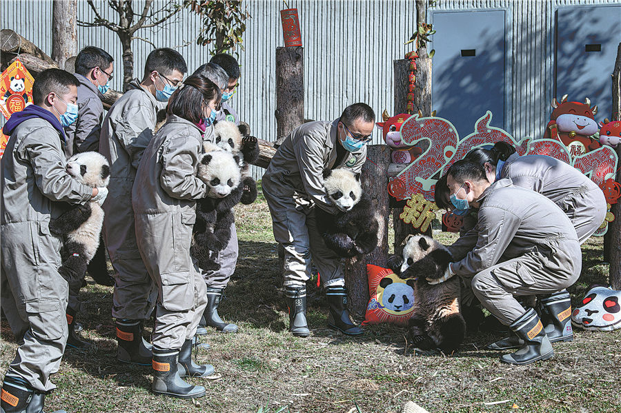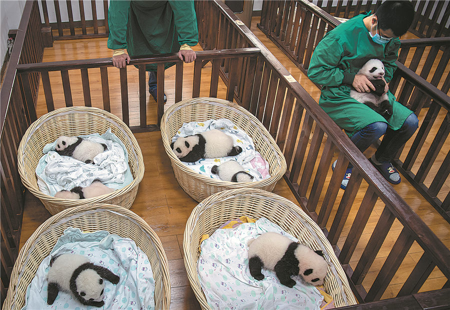 Two nurses look after eight panda cubs born in 2021. HE HAIYANG/FOR CHINA DAILY