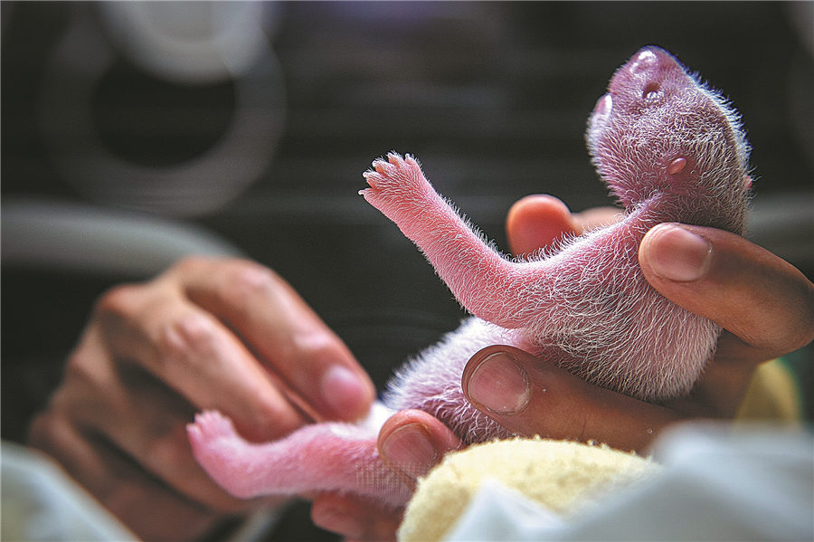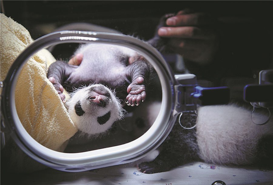 Zhenzhen's one-month-old cubs have a thorough physical check-up in the incubator. HE HAIYANG/FOR CHINA DAILY