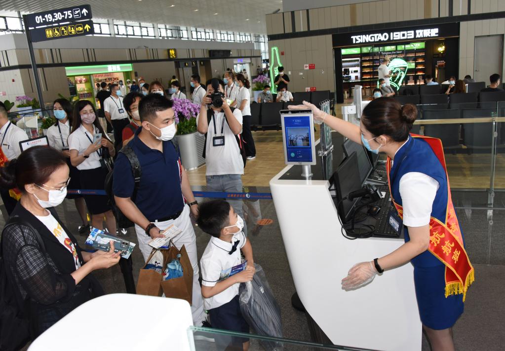 Passengers check in via a facial recognition facility at the terminal of Qingdao Jiaodong International Airport in Qingdao, east China's Shandong Province, Aug. 12, 2021. (Xinhua/Li Ziheng)
