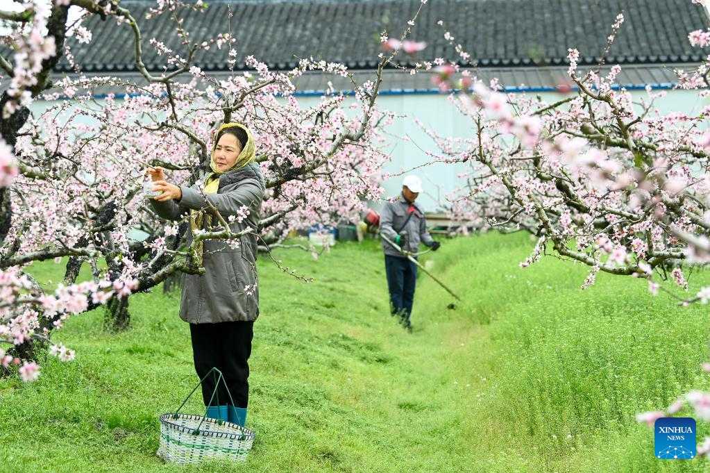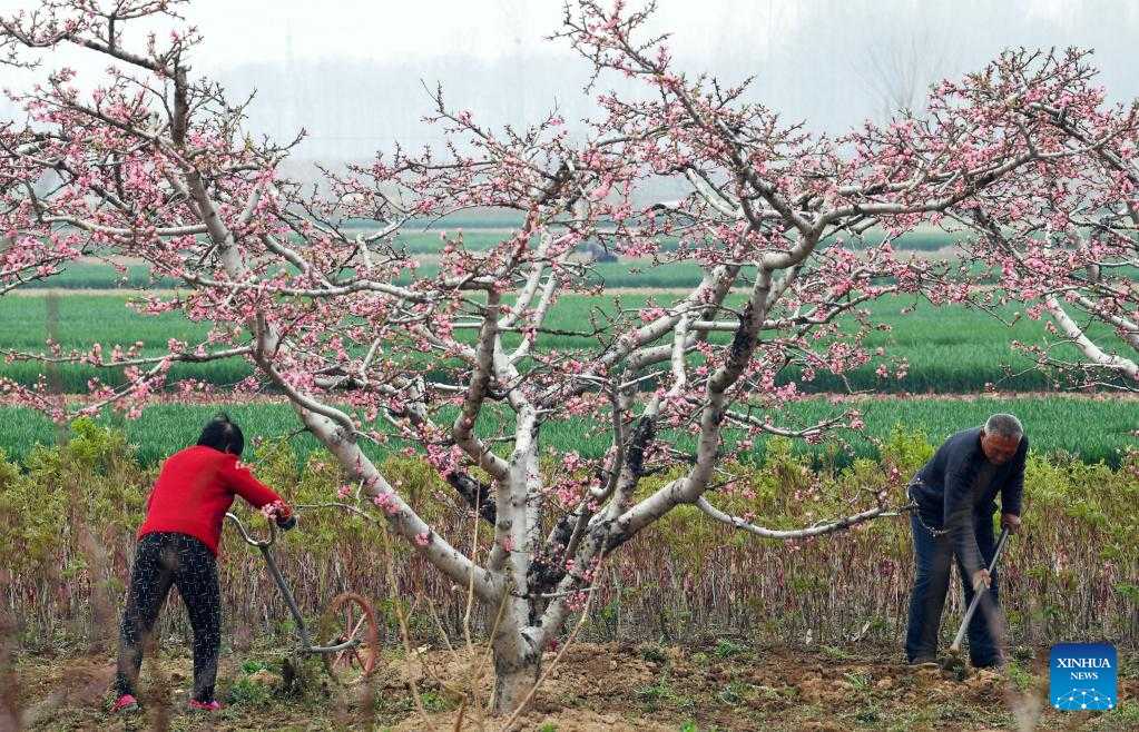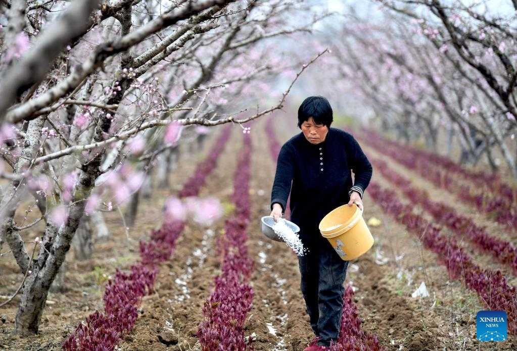 A farmer works in an orchard in Wuma Town of Bozhou, east China's Anhui Province, on the date of Chunfen, which falls on March 20, 2022. Chunfen, or spring equinox, is an important date for Chinese farmers. Not only is it one of the 24 solar terms on the Chinese lunar calendar that reflect changes in the seasons, but it also signals the start of one of the year's busiest farming periods. This year, Chunfen falls on March 20, and farms across the country are already a hive of activity. (Photo by Liu Qinli/Xinhua)