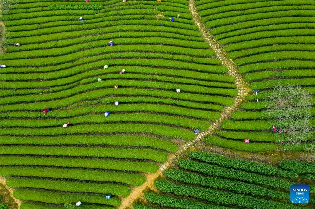 Aerial photo shows farmers picking tea leaves in Yuyao, east China's Zhejiang Province, on the date of Chunfen, which falls on March 20, 2022. Chunfen, or spring equinox, is an important date for Chinese farmers. Not only is it one of the 24 solar terms on the Chinese lunar calendar that reflect changes in the seasons, but it also signals the start of one of the year's busiest farming periods. This year, Chunfen falls on March 20, and farms across the country are already a hive of activity. (Photo by Zhang Hui/Xinhua)