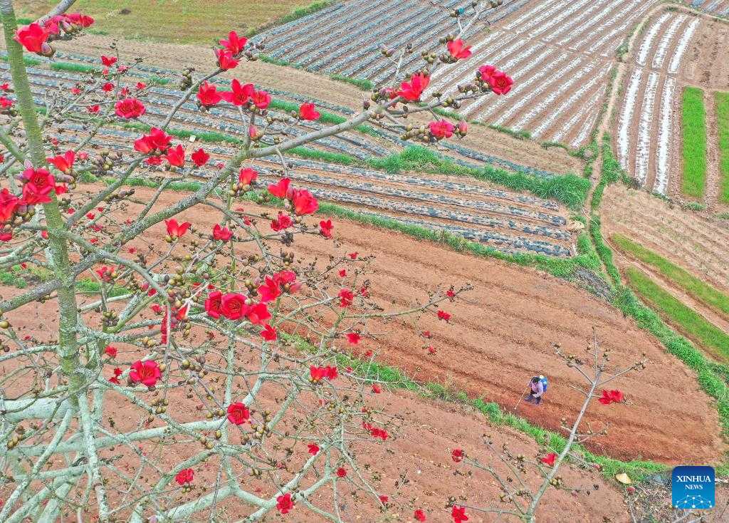Aerial photo shows a farmer working in the field in Pumiao Town of Nanning, south China's Guangxi Zhuang Autonomous Regionon, on the date of Chunfen, which falls on March 20, 2022. Chunfen, or spring equinox, is an important date for Chinese farmers. Not only is it one of the 24 solar terms on the Chinese lunar calendar that reflect changes in the seasons, but it also signals the start of one of the year's busiest farming periods. This year, Chunfen falls on March 20, and farms across the country are already a hive of activity. (Xinhua/Zhou Hua)