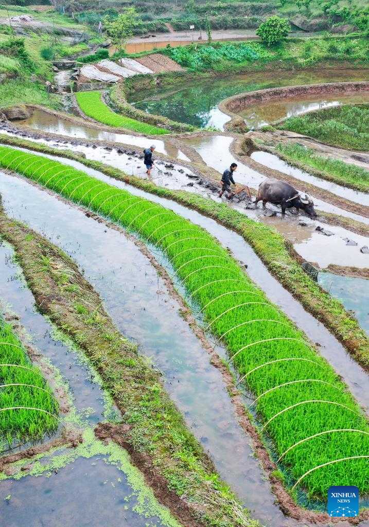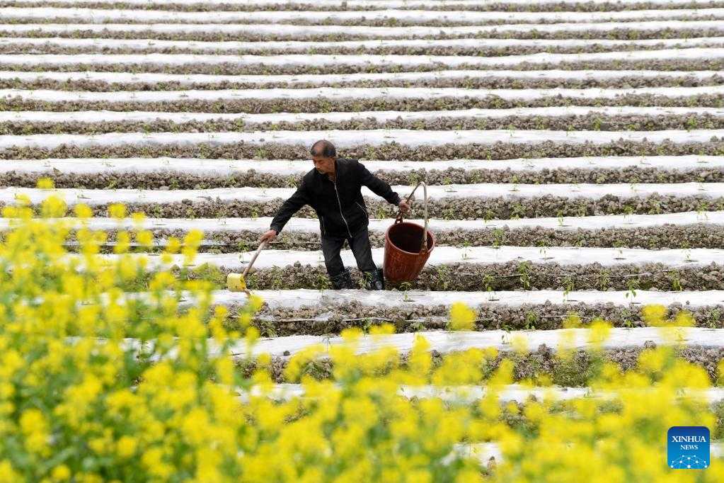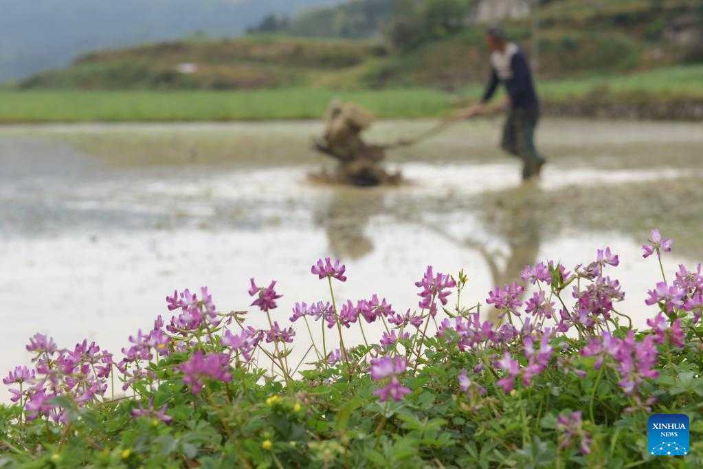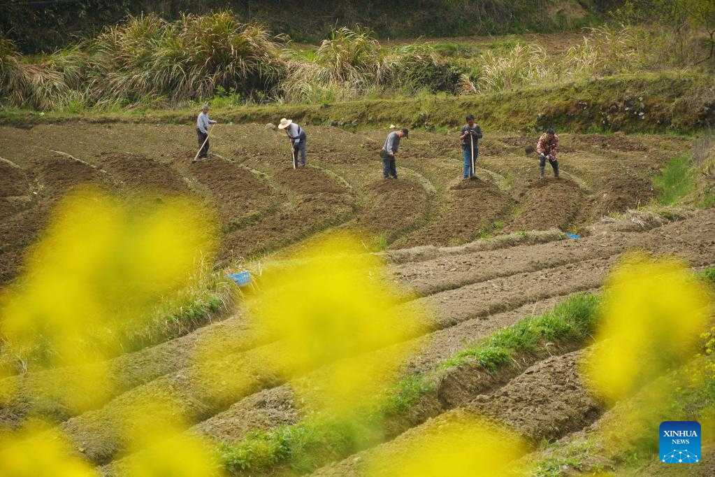 (220404) -- CENGONG, April 4, 2022 (Xinhua) -- A villager works in the fields in Zhouping Village of Cengong County, southwest China's Guizhou Province, April 4, 2022. As the temperature gradually rises around the time of Qingming Festival, farming activities are in full swing across the country, from the north to the south. (Photo by Tang Peng/Xinhua)
