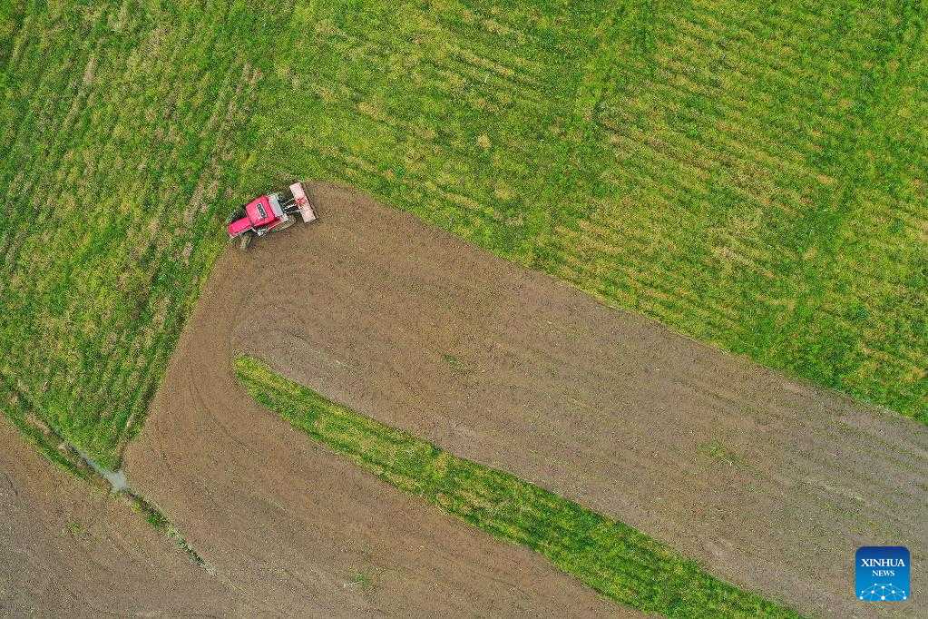 (220404) -- YONGZHOU, April 4, 2022 (Xinhua) -- A villager works in the fields in Guitou Village of Yongzhou, central China's Hunan Province, April 4, 2022. As the temperature gradually rises around the time of Qingming Festival, farming activities are in full swing across the country, from the north to the south. (Photo by He Hongfu/Xinhua)
