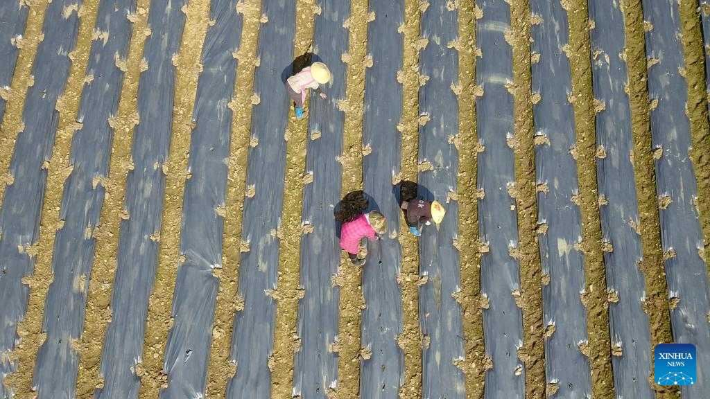 (220404) -- ANQING, April 4, 2022 (Xinhua) -- Villagers work in the fields in Xiying Village of Anqing, east China's Anhui Province, April 4, 2022. As the temperature gradually rises around the time of Qingming Festival, farming activities are in full swing across the country, from the north to the south. (Photo by Wu Junqi/Xinhua)