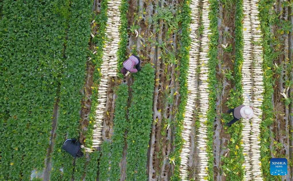 Aerial photo shows villagers working in the fields in Hexi Township of Nanchong, southwest China's Sichuan Province, April 4, 2022. As the temperature gradually rises around the time of Qingming Festival, farming activities are in full swing across the country, from the north to the south. (Photo by Yu Zhonghua/Xinhua)
