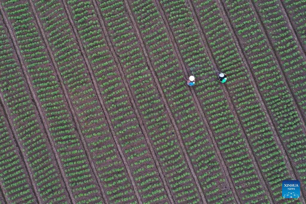 (220404) -- SHIJIAZHUANG, April 4, 2022 (Xinhua) -- Villagers work in the fields in Tanchong Village of Hezhou, south China's Guangxi Zhuang Autonomous Region, April 4, 2022. As the temperature gradually rises around the time of Qingming Festival, farming activities are in full swing across the country, from the north to the south. (Photo by Liao Zuping/Xinhua)