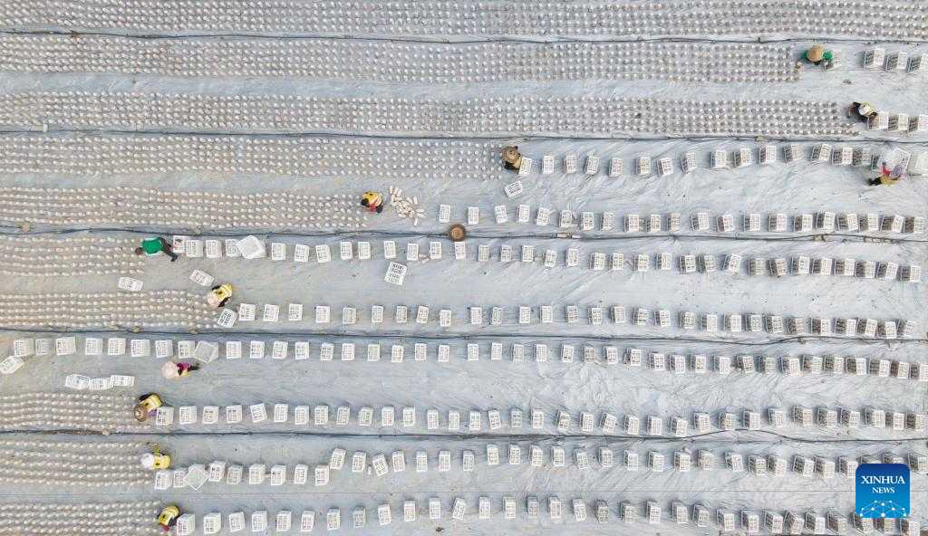 (220404) -- ZUNHUA, April 4, 2022 (Xinhua) -- Aerial photo shows villagers working in the fields in Xizhuang Village of Zunhua, north China's Hebei Province, April 4, 2022. As the temperature gradually rises around the time of Qingming Festival, farming activities are in full swing across the country, from the north to the south. (Photo by Liu Mancang/Xinhua)