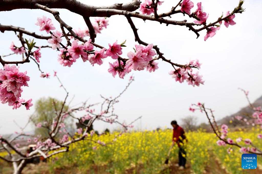 (220404) -- ZAOZHUANG, April 4, 2022 (Xinhua) -- A villager works in the fields in Mengzhuang Township of Zaozhuang, east China's Shandong Province, April 4, 2022. As the temperature gradually rises around the time of Qingming Festival, farming activities are in full swing across the country, from the north to the south. (Photo by Sun Zhongzhe/Xinhua)