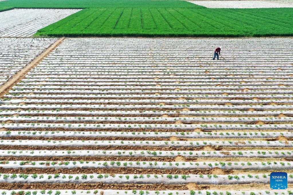(220404) -- LIANYUNGANG, April 4, 2022 (Xinhua) -- A villager works in the fields in Hanli Village of Lianyungang, east China's Jiangsu Province, April 4, 2022. As the temperature gradually rises around the time of Qingming Festival, farming activities are in full swing across the country, from the north to the south. (Photo by Wang Chun/Xinhua)