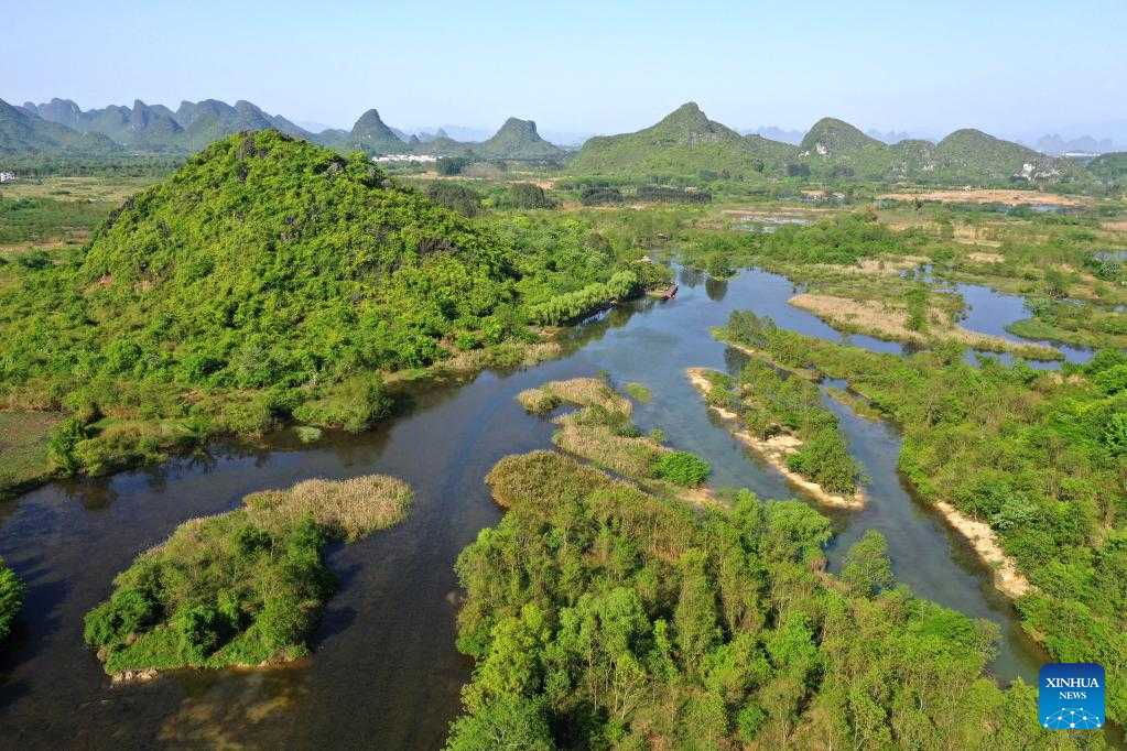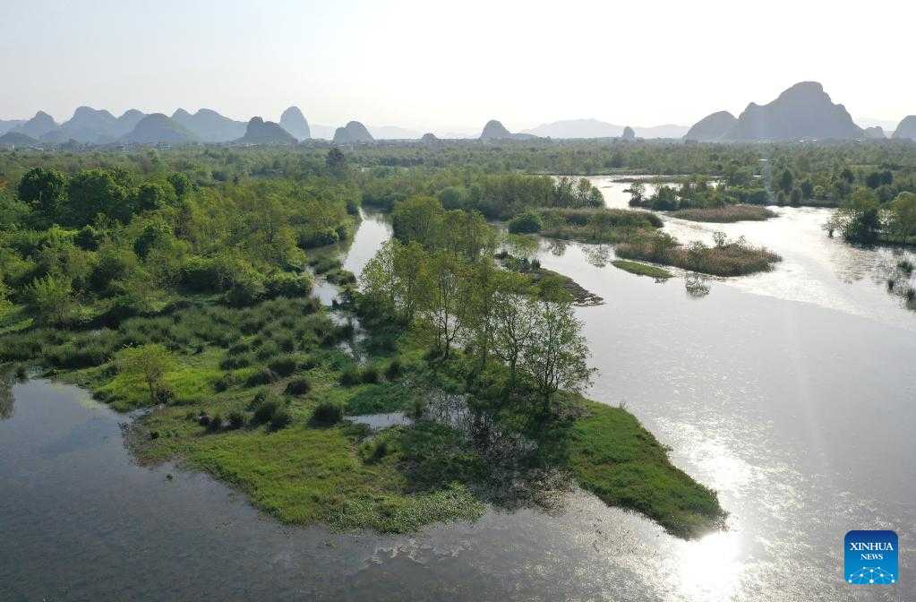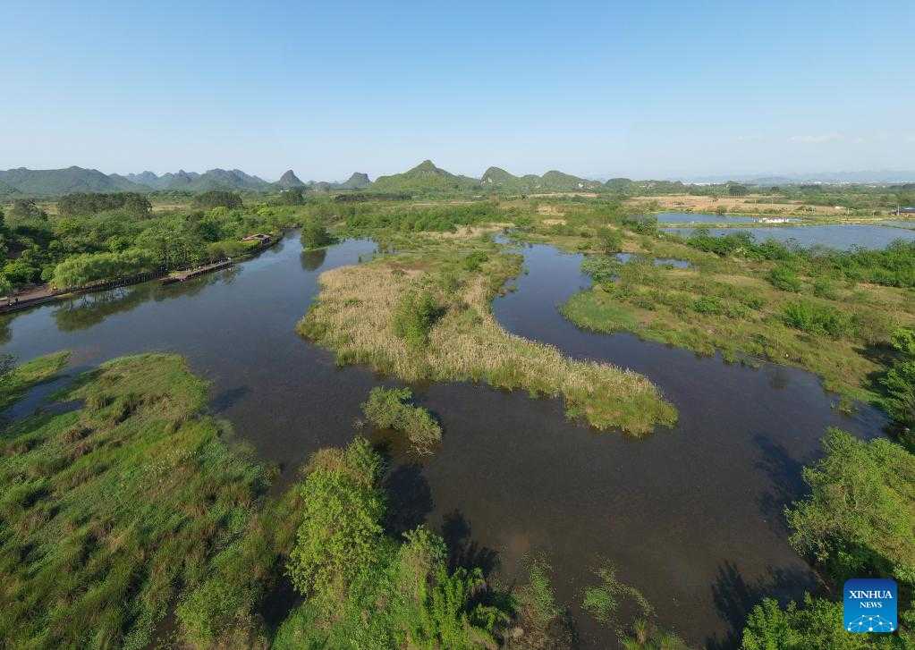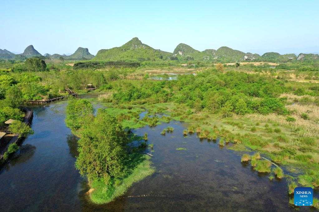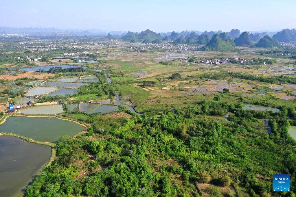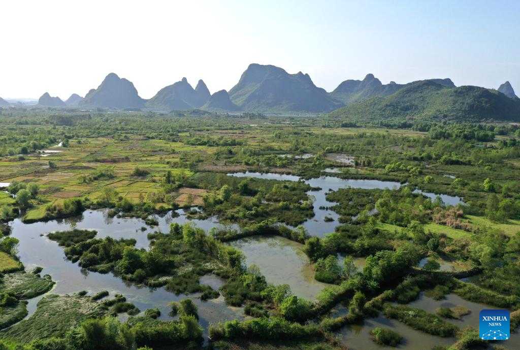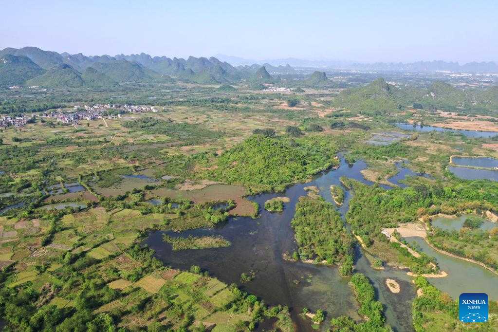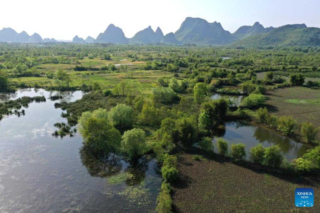 Aerial photo taken on April 7, 2022 shows the scenery of the Huixian Wetlands in Guilin, south China's Guangxi Zhuang Autonomous Region. (Xinhua/Zhou Hua)