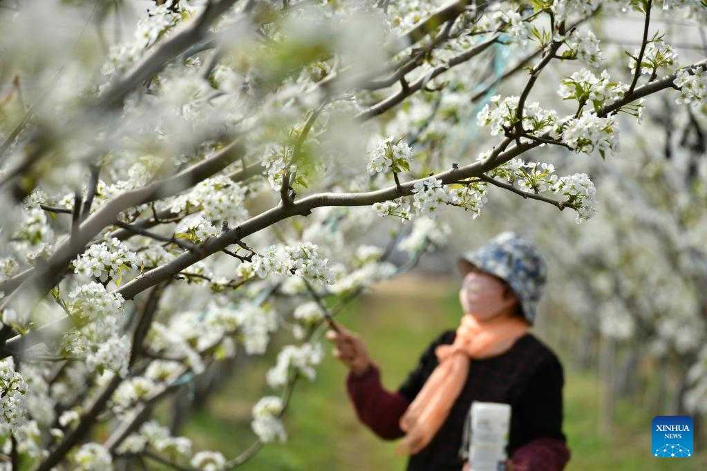 A farmer pollinates pear flowers in a pear orchard in Xiangyuan Village of Pingyao County, Jinzhong City, north China’s Shanxi Province, April 10, 2022. (Xinhua/Liang Shengren)