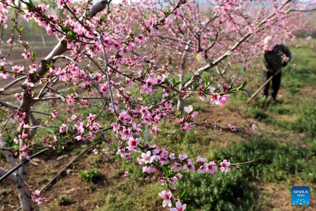A farmer works in a peach field in Qianliang Village of Qicun Town, Zaozhuang City, east China's Shandong Province, April 10, 2022. (Xinhua/Sun Zhongzhe)