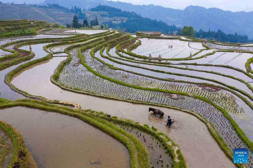 Aerial photo taken on April 10, 2022 shows a farmer working in a terraced field in Cenfeng Village of Cuili Town, Congjiang County, Qiandongnan Miao and Dong Autonomous Prefecture, southwest China’s Guizhou Province. (Xinhua/Wu Dejun)