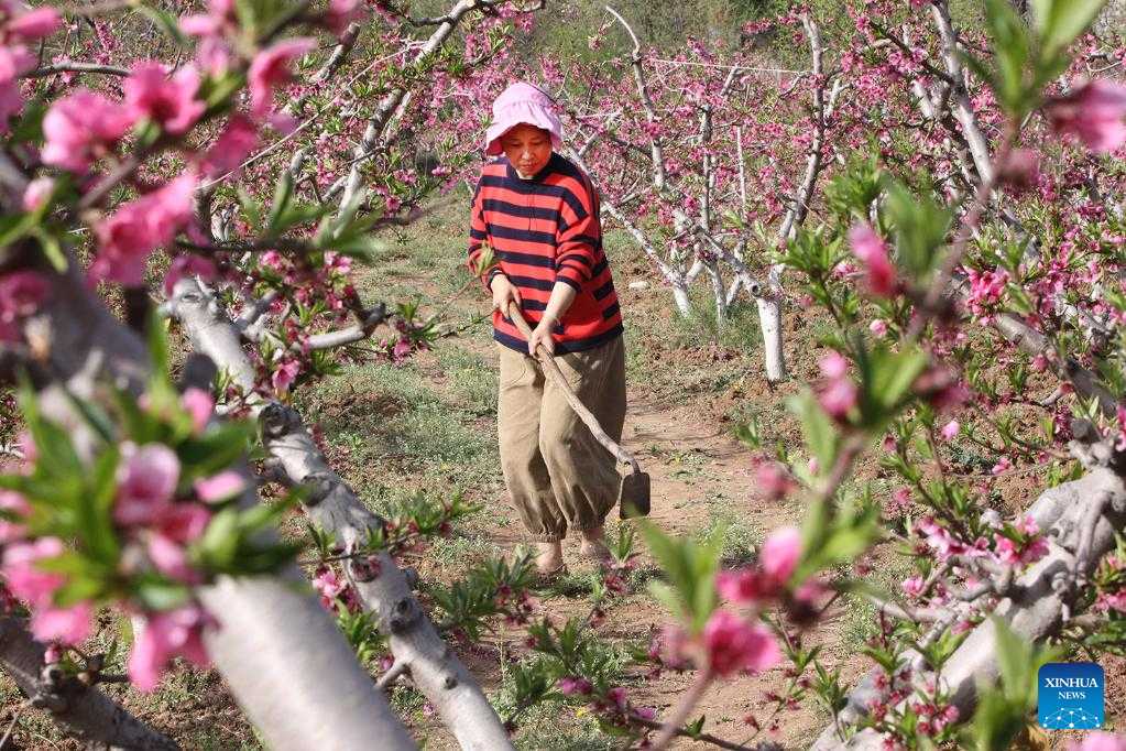 A farmer hoes in a winter peach field in Xuantanmiao Village of Boai County, Jiaozuo City, central China’s Henan Province, April 10, 2022. (Xinhua/Cheng Quan)