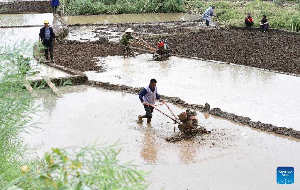 Farmers drive rotary tillers in a field in Yangjiazhai Village of Dashuijing Town, Luoping County, southwest China’s Yunnan Province, April 10, 2022. (Xinhua/Mao Hong)