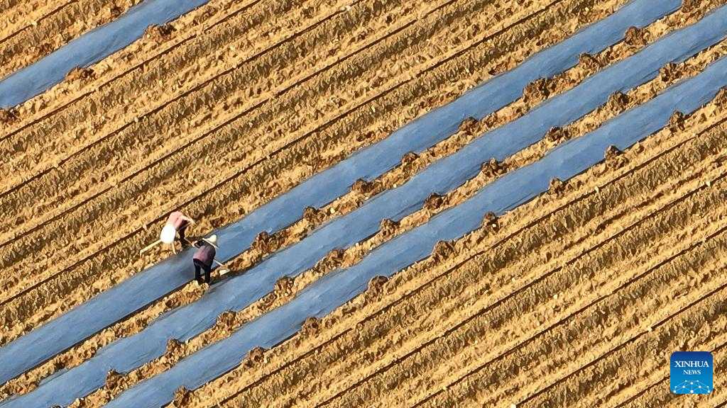 A farmer manages potato seedlings sown in a field in Sangcun Town of Shanting District, Zaozhuang City, east China’s Shandong Province, April 10, 2022. (Xinhua/Li Zongxian)
