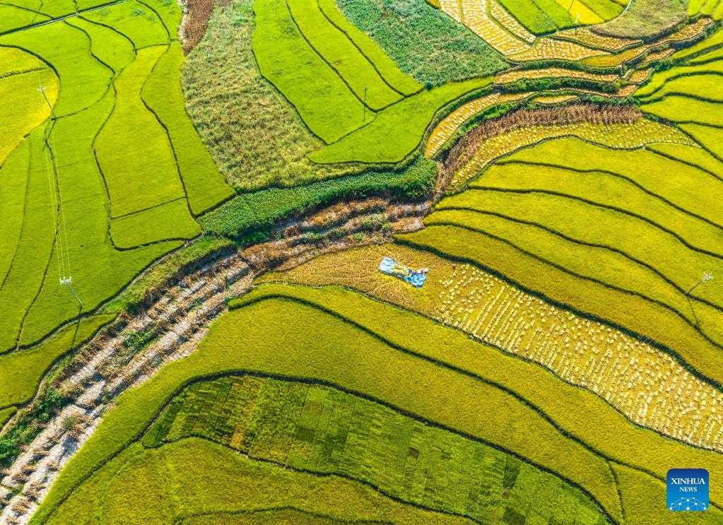 Aerial photo taken on Sept. 3, 2022 shows villagers harvesting rice in Pingtan Village of Pingtan Township of Tongdao Dong Autonomous County in Huaihua City, central China's Hunan Province. (Photo by Su Yongzhu/Xinhua)