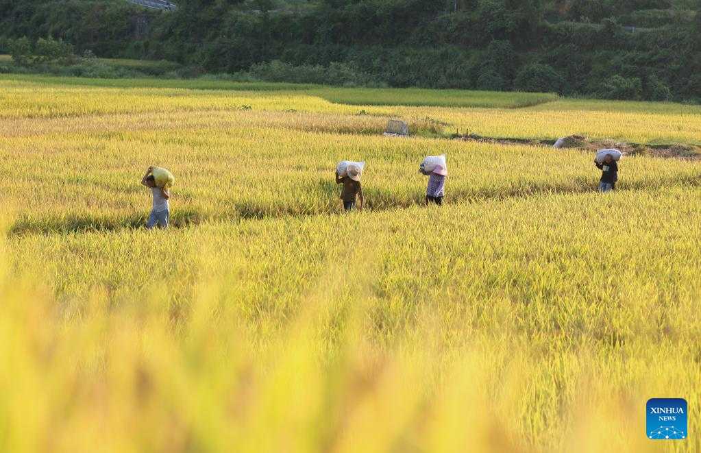 Villagers transport harvested rice in Pingtan Village, Tongdao Dong Autonomous County in Huaihua City, central China's Hunan Province, Sept. 3, 2022. (Photo by Su Yongzhu/Xinhua)