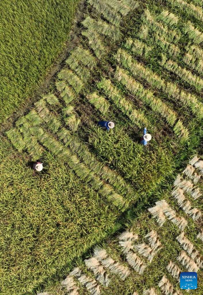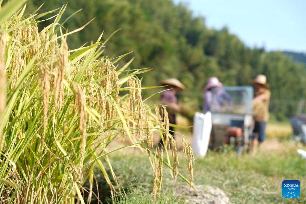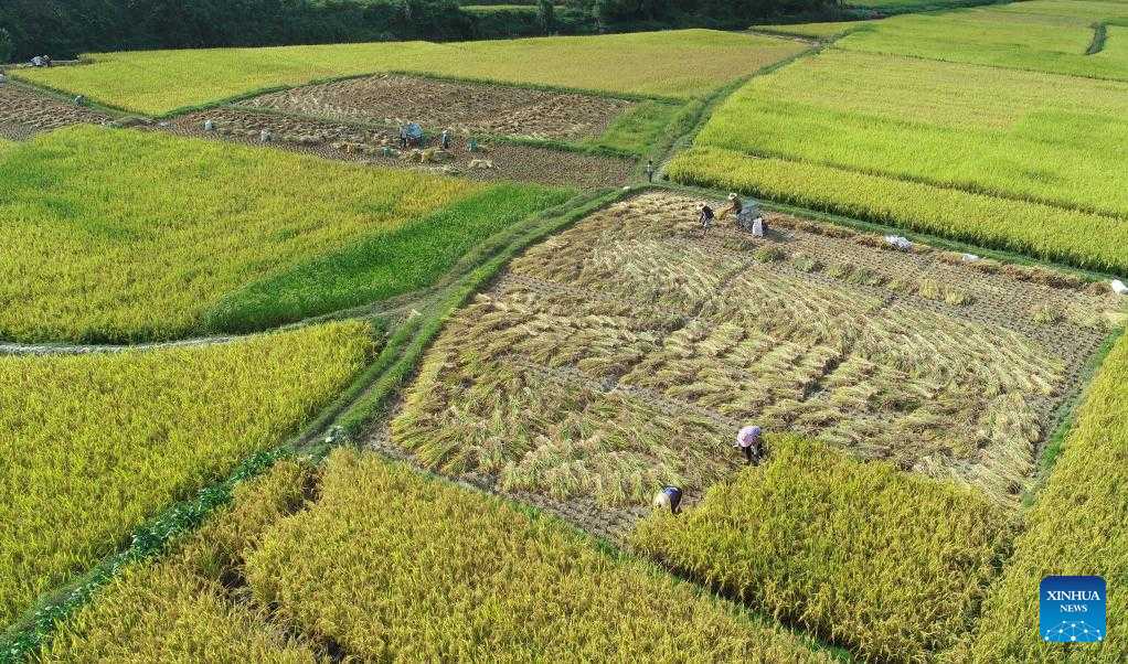 Villagers harvest rice in Pingtan Village of Pingtan Township of Tongdao Dong Autonomous County in Huaihua City, central China's Hunan Province, Sept. 3, 2022. (Photo by Wu Sandong/Xinhua)